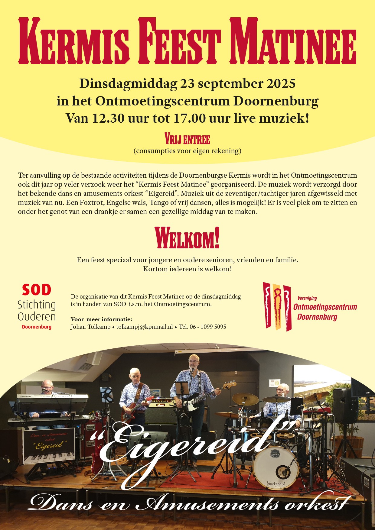 Dinsdag 23 september wordt er in het Ontmoetingscentrum van Doornenburg de jaarlijkse Kermis Feest Matinee, georganiseerd door Stichting Ouderen Doornenburg i.s.m. Vereniging Ontmoetingscentrum.