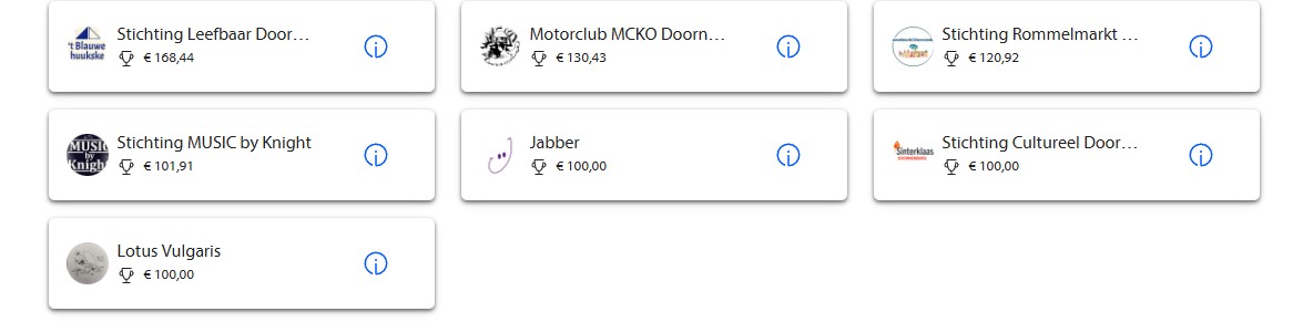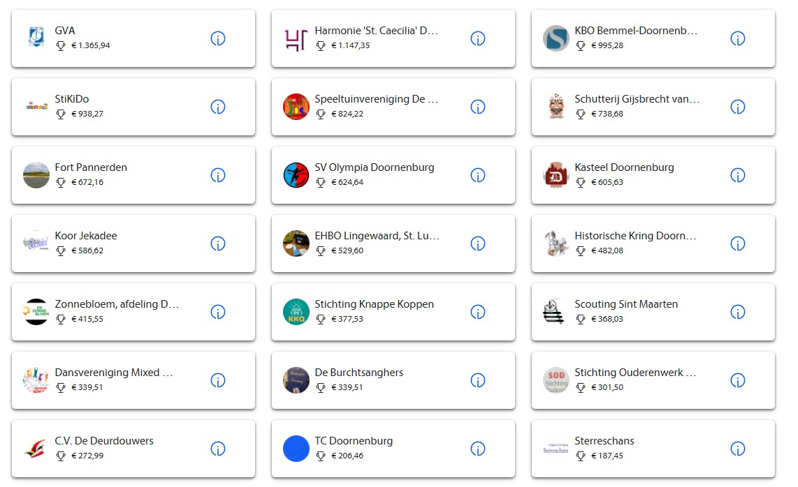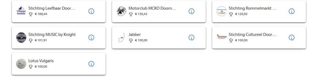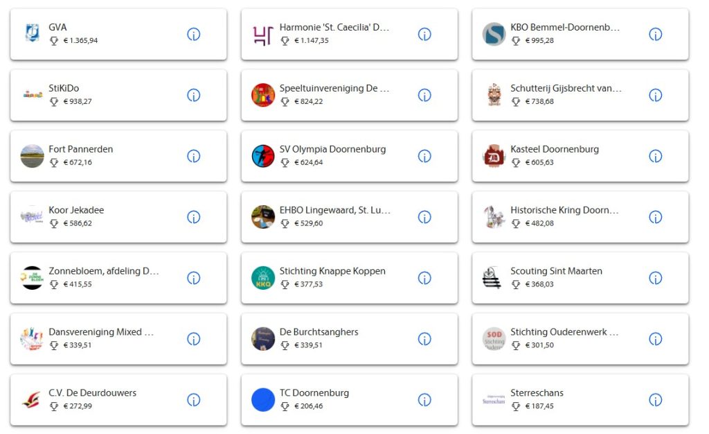 Zo’n 28 verenigingen hadden zich enkele maanden geleden ingeschreven en kregen afgelopen weken een behoorlijk aantal stemmen. Topper was – zoals vrijwel ieder jaar – voetbalvereniging GVA met een bedrag van € 1365,94, gevolgd door prachtharmonie St. Caecilia die € 1147,35 scoort.