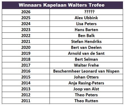 Nieuwsgierig wordt uitgekeken naar de bekendmaking van de Kapelaan Walters Trofee. Deze prijs is genoemd naar de oprichter van St.Caecilia Kapelaan Stef Walter , en zal voor 16e maal worden uitgereikt aan de persoon die zich op een bijzondere wijze heeft ingezet voor de vereniging. De vraag is dus: wie mag deze eervolle prijs in na winnaar Alex Ubbink als opvolger in ontvangst mag komen nemen?