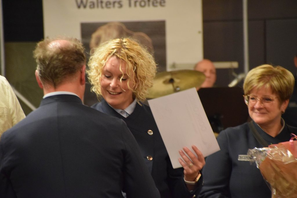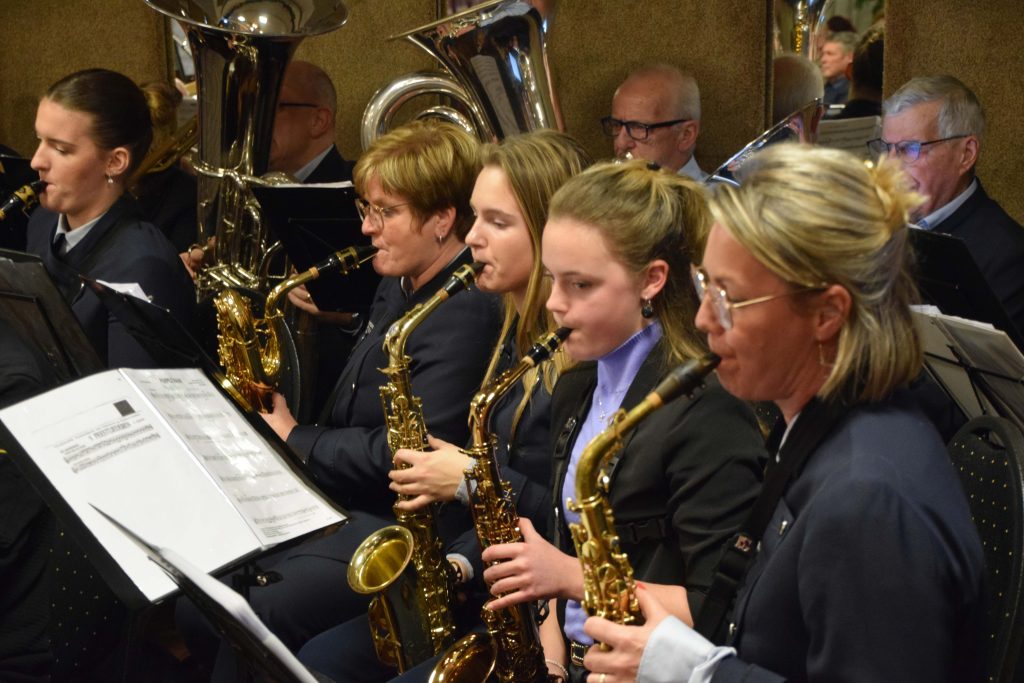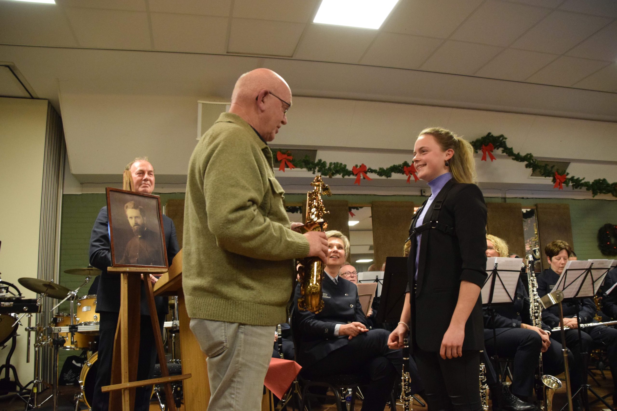 Voorzitter van het instrumentenfonds Bud Joosten doneerde weer een prachtig bedrag van 5.000 aan de harmonie en overhandigde meteen een nei-jje saxofoon aan één van de jongste (en nei-jste) jeugdleden Liv van Geelen.