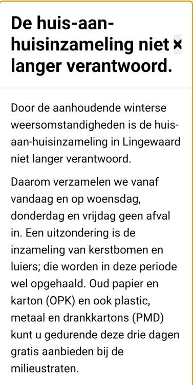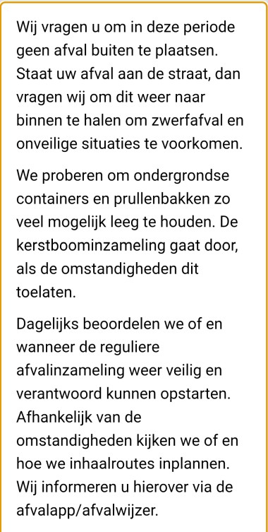 Via de afval app van de gemeente worden inwoners van Lingewaard op de hoogte gehouden wanneer de huis-aan-huis inzameling weer wordt opgestart.
