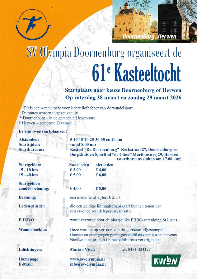 In het weekend van 28 en 29 maart 2026 organiseert SV Olympia Doornenburg de 61e Kasteeltocht.